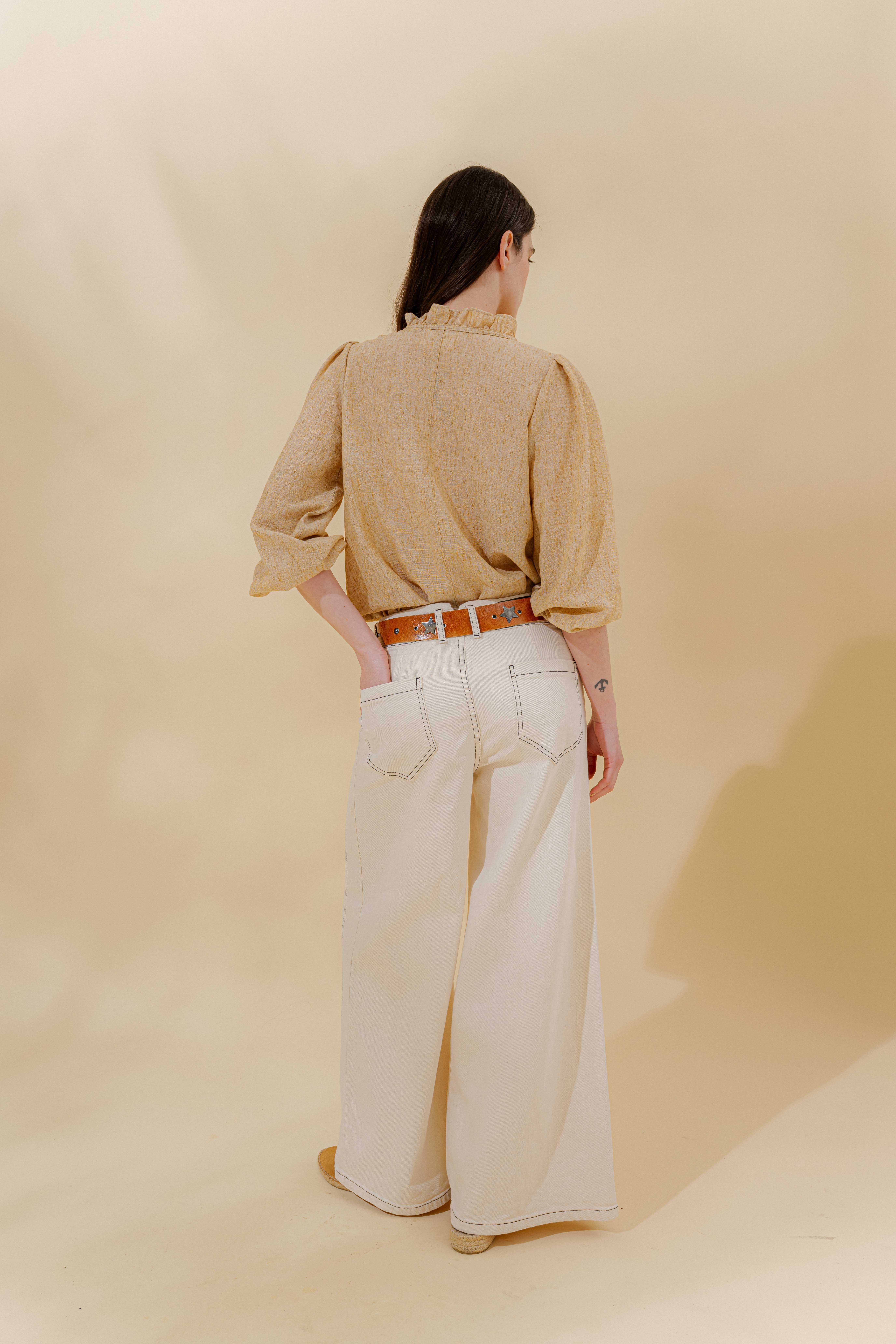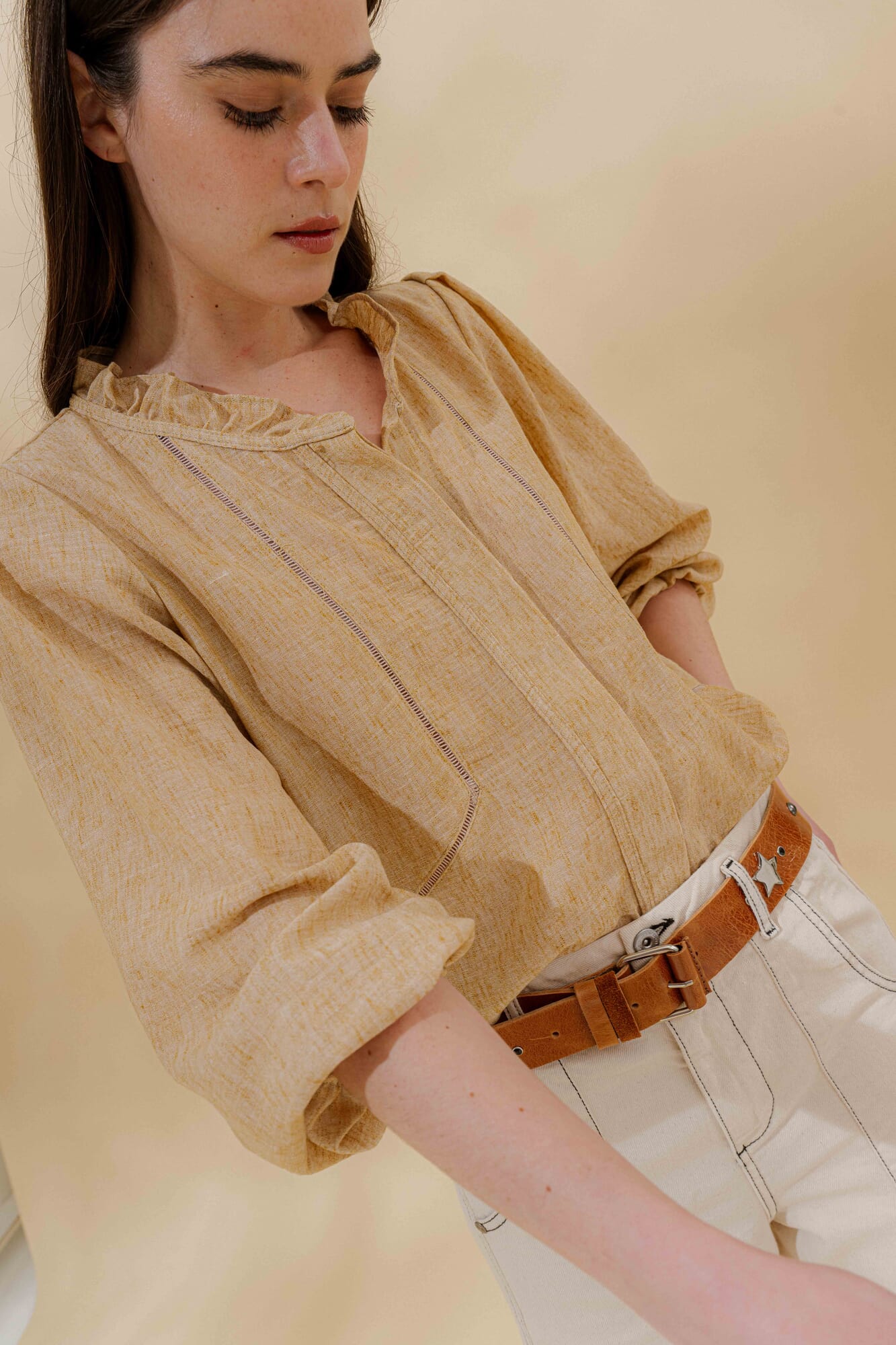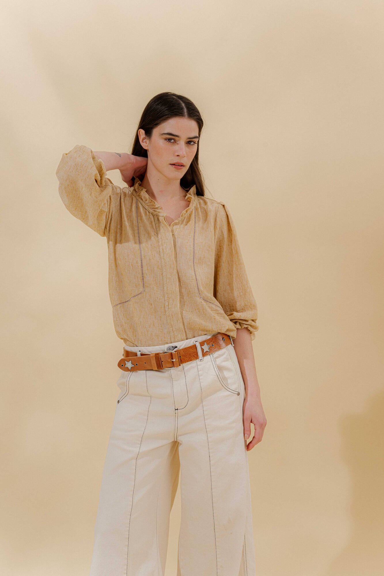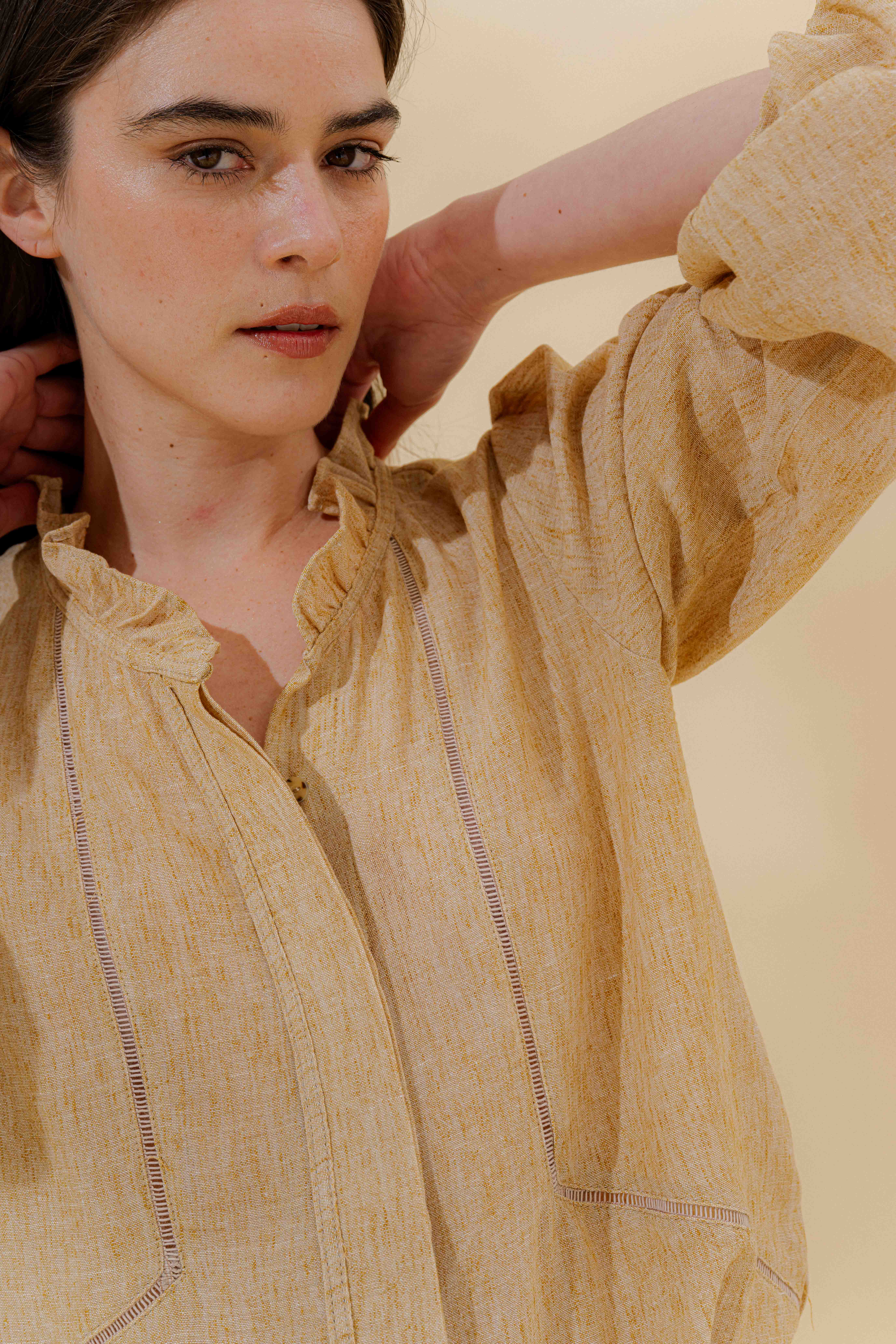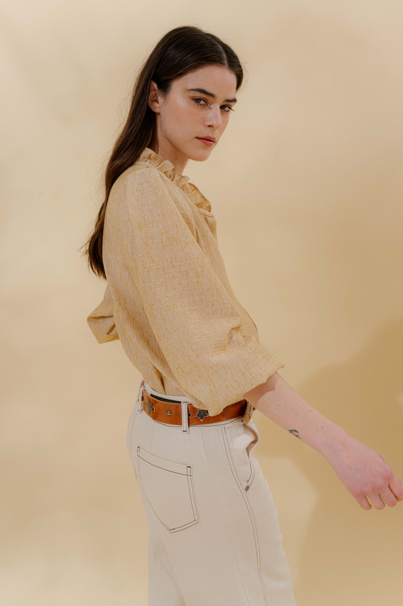 Cuello mao con volante fruncido y manga larga con puño elástico para generar más volumen.