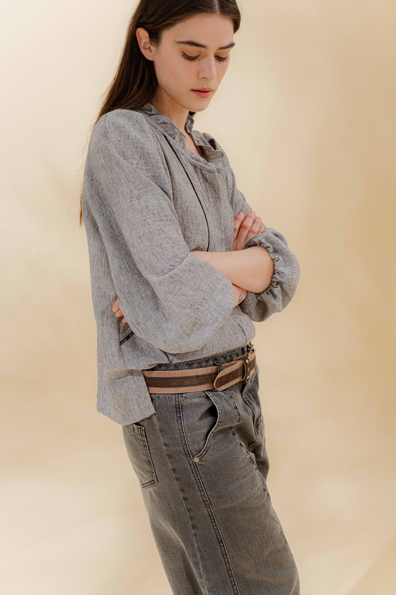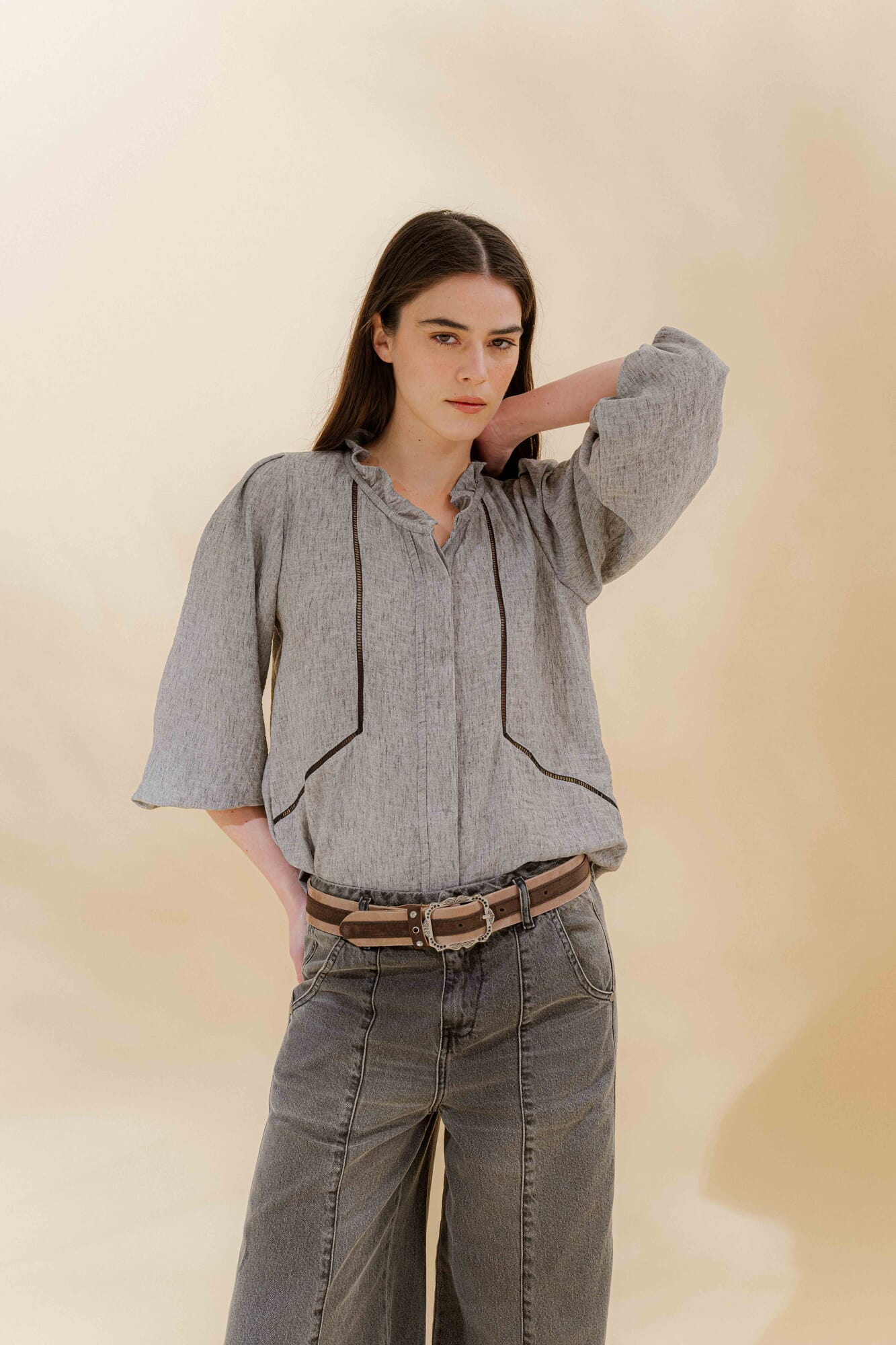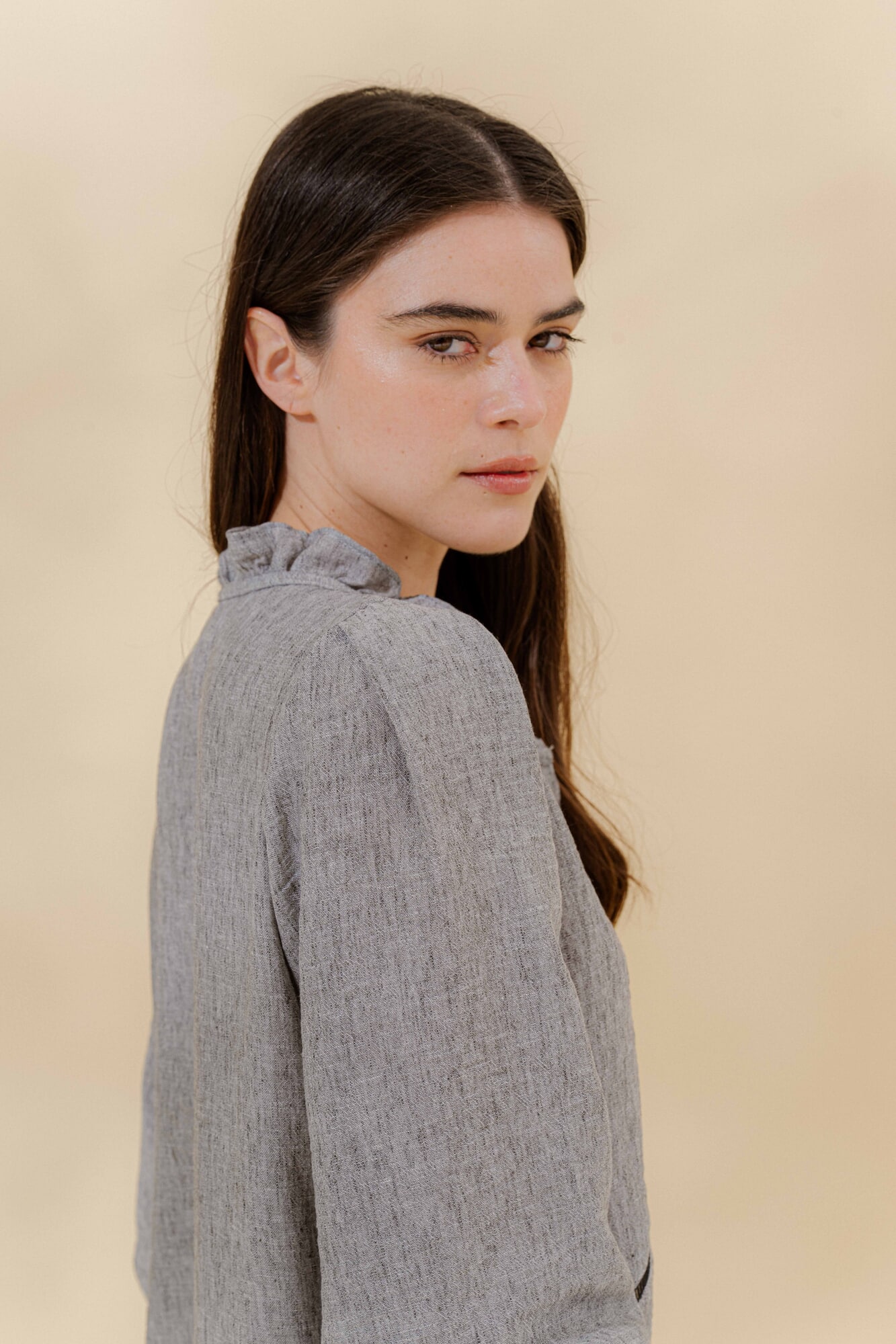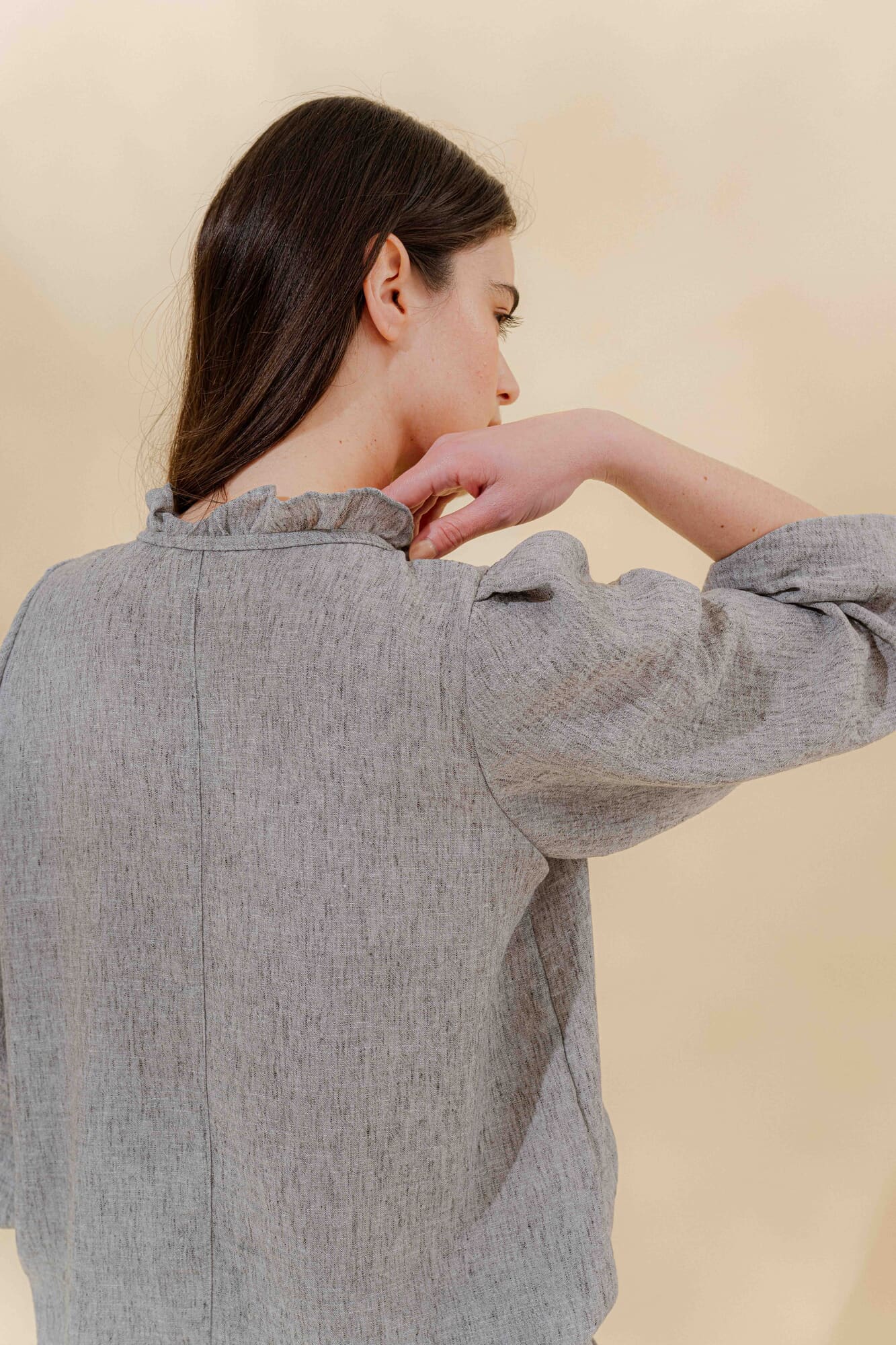 Cuello mao con volante fruncido y manga larga con puño elástico para generar más volumen.