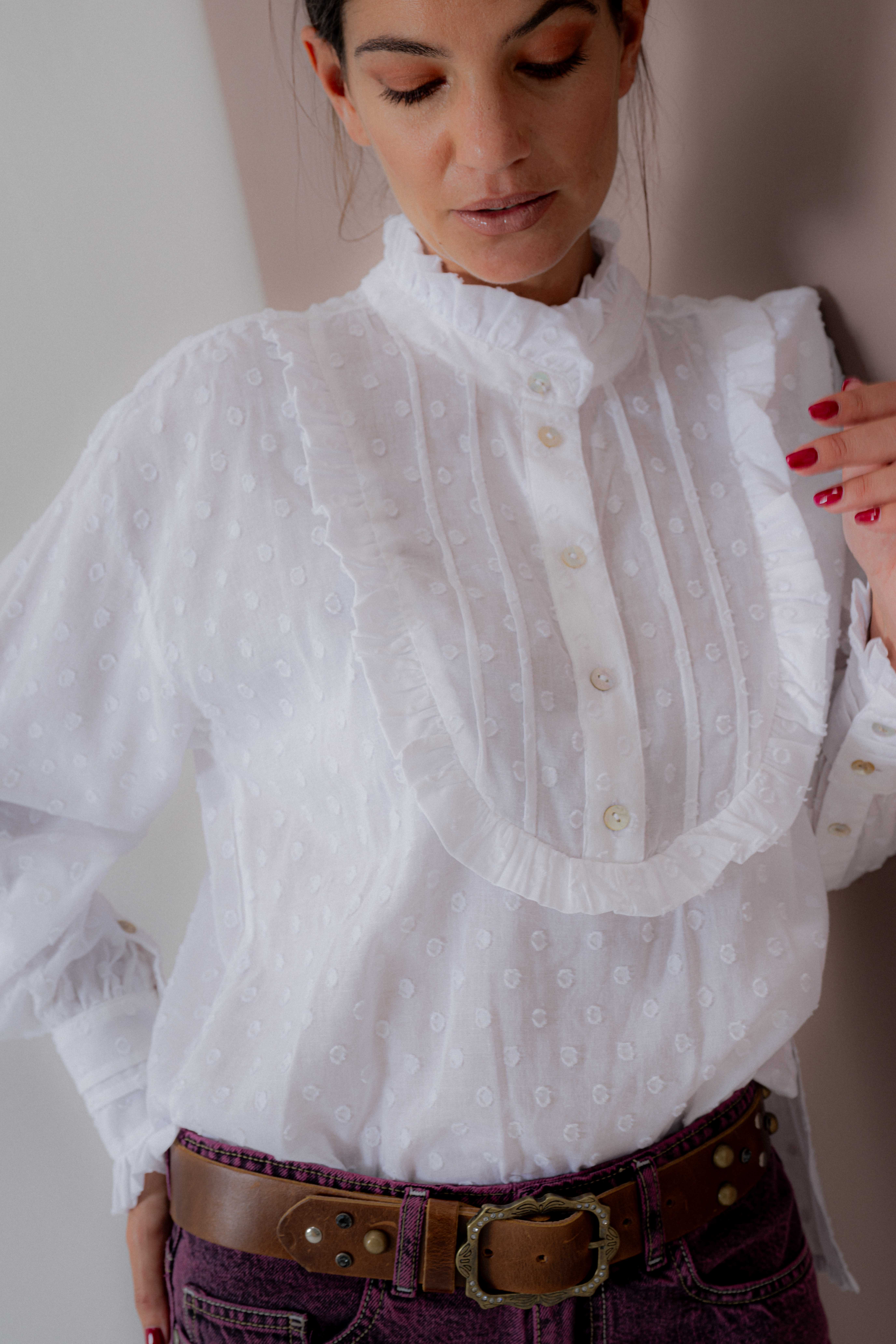 La pechera con alforzas y voladitos hacen de esta prenda una joyita de la colección.