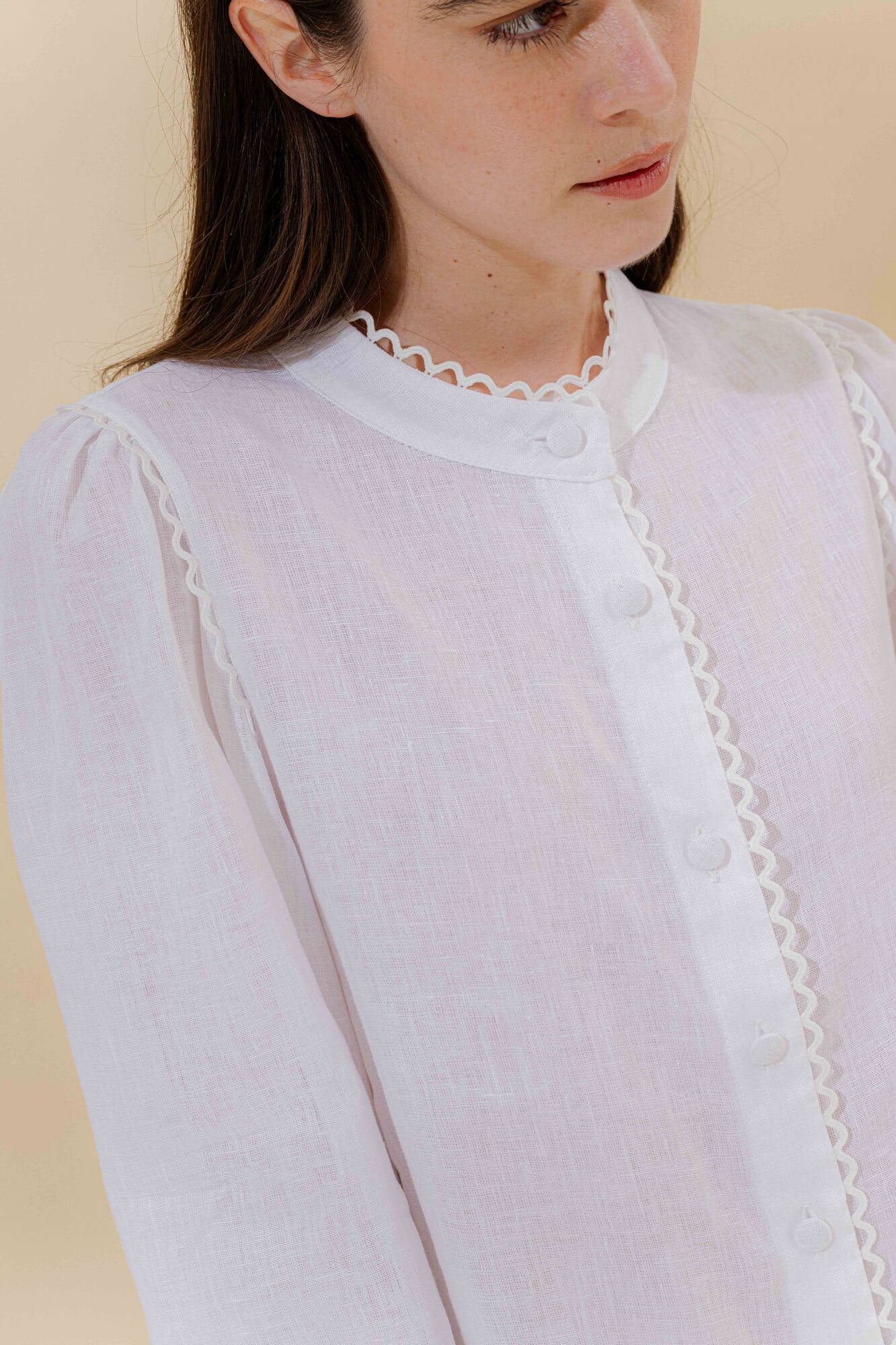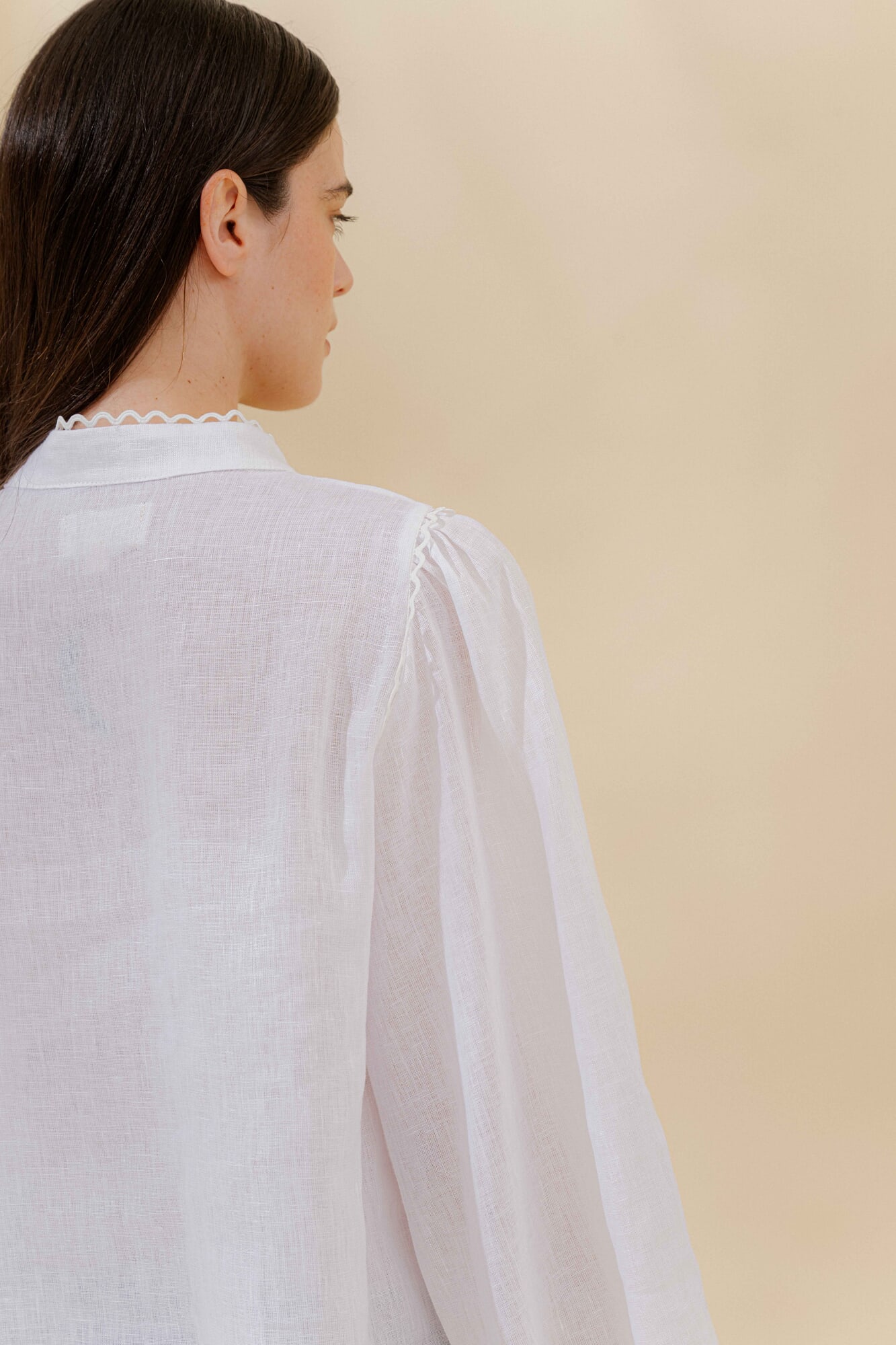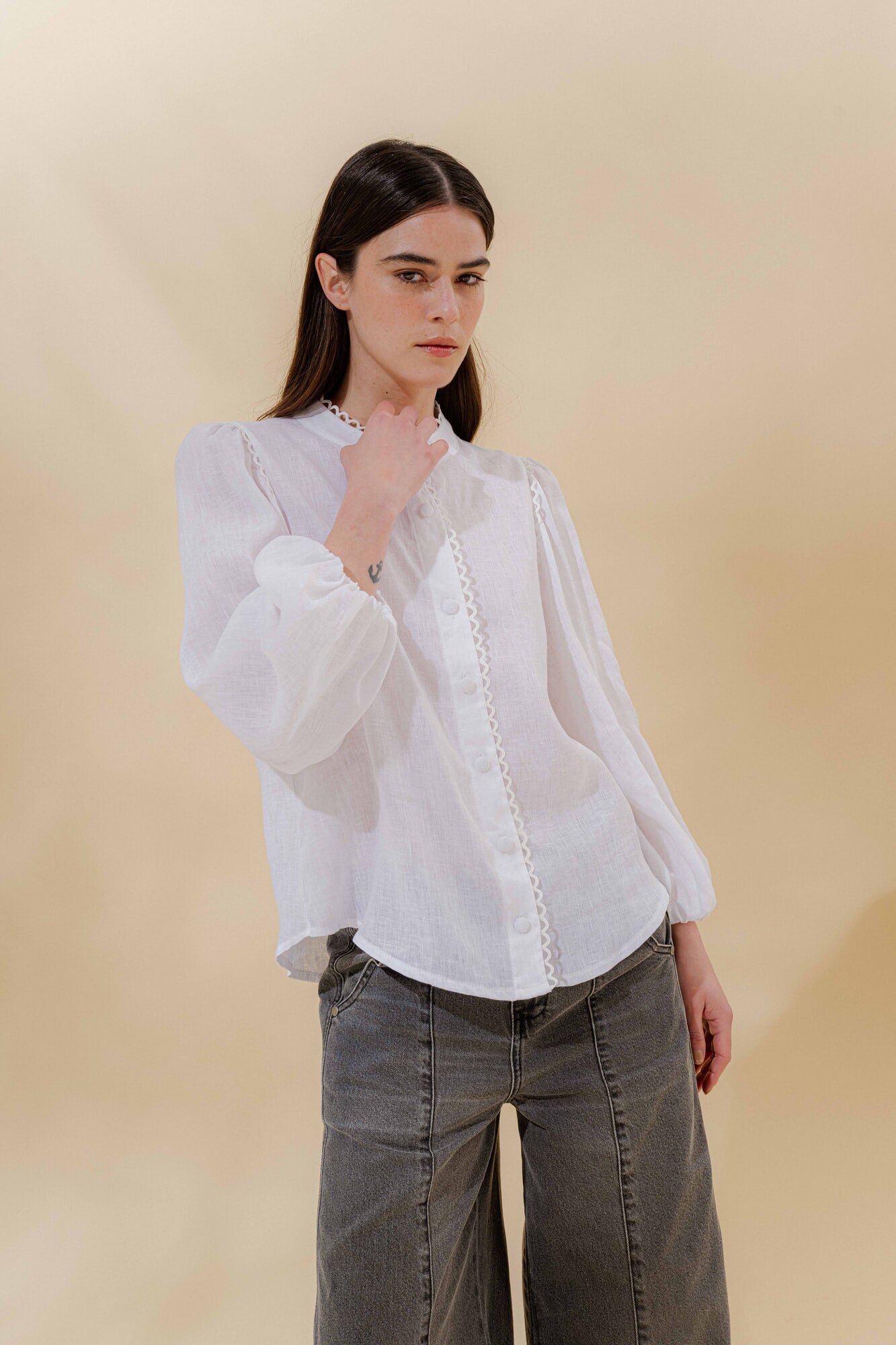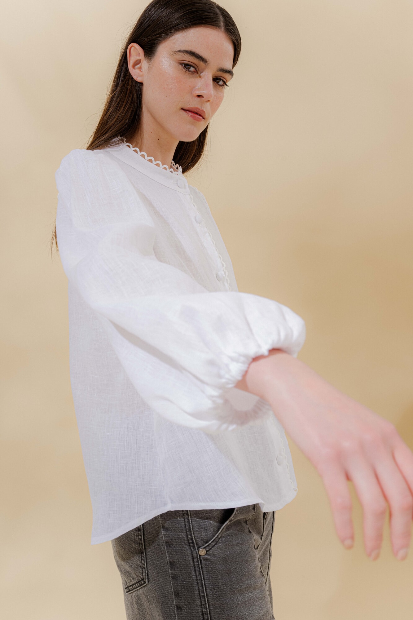 Camisa confeccionada en lino 100 % . Tiene cuello Mao , mangas con volumen generada con frunces y elástico en el puño.