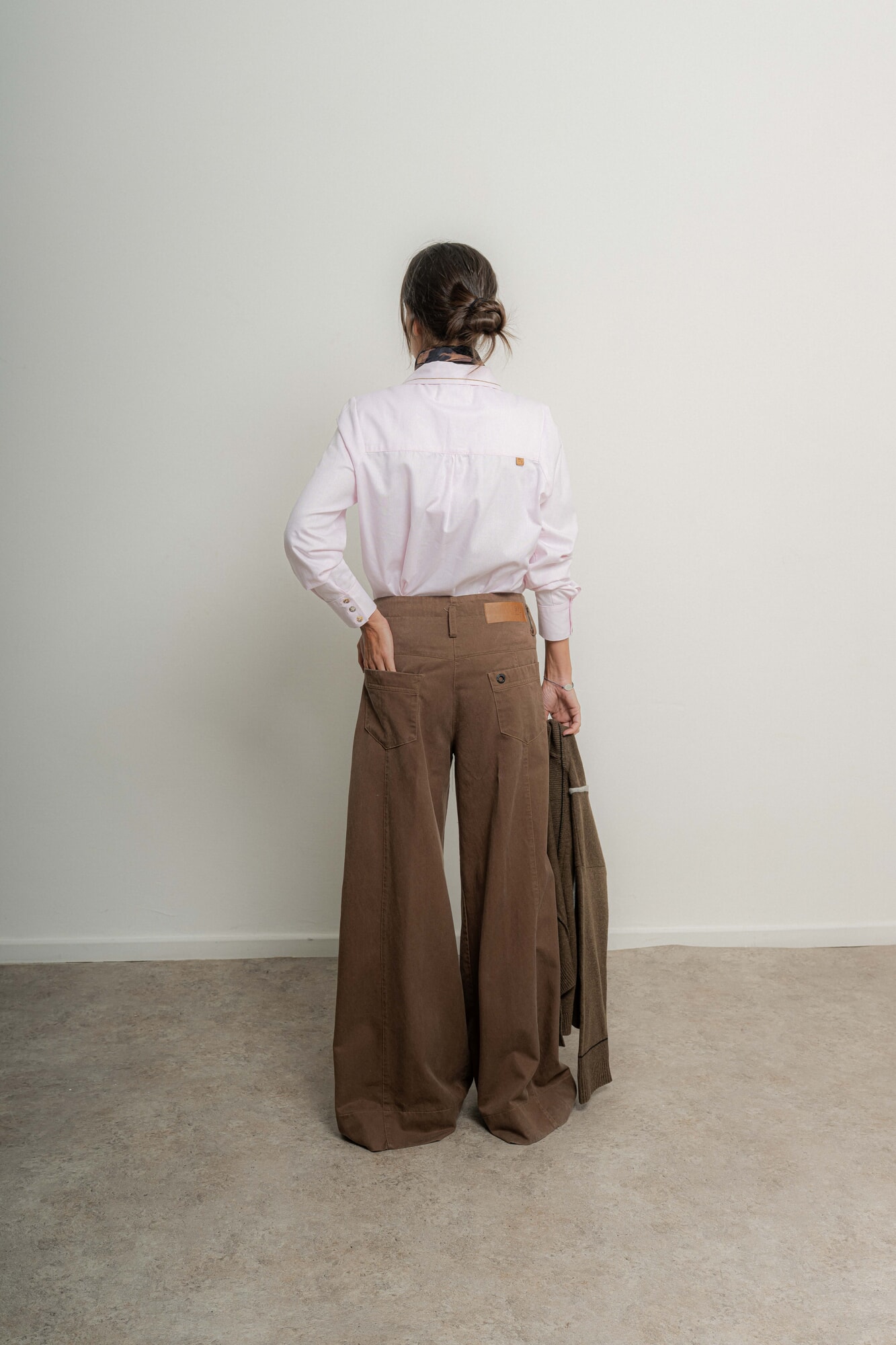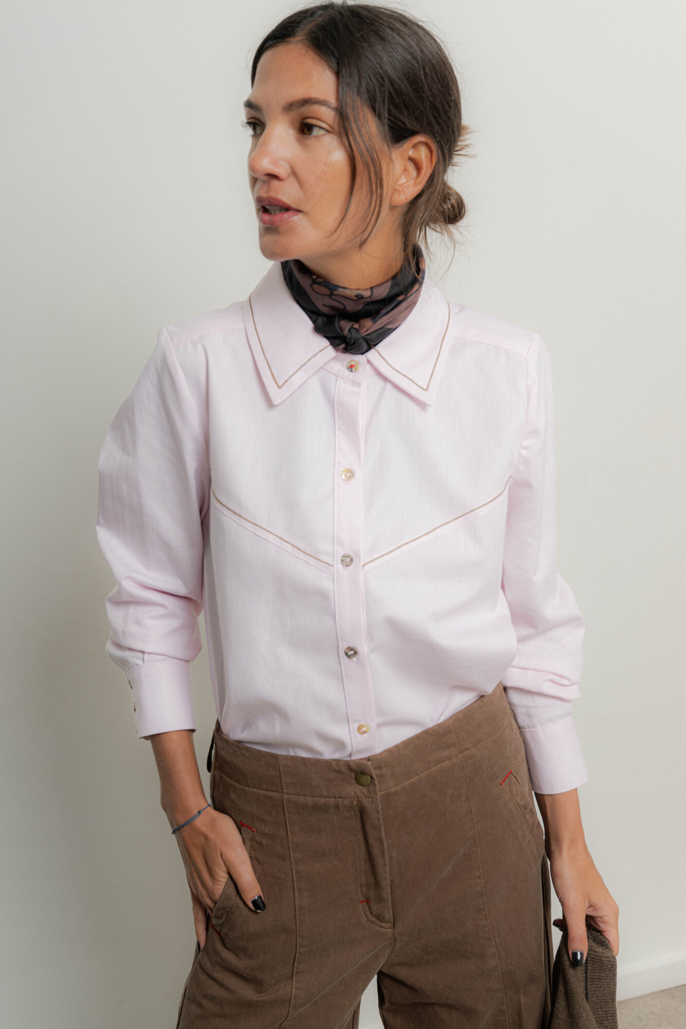 Camisa con cuello tipo masculina. Abotonadura central, manga larga y puños con botones en mangas.