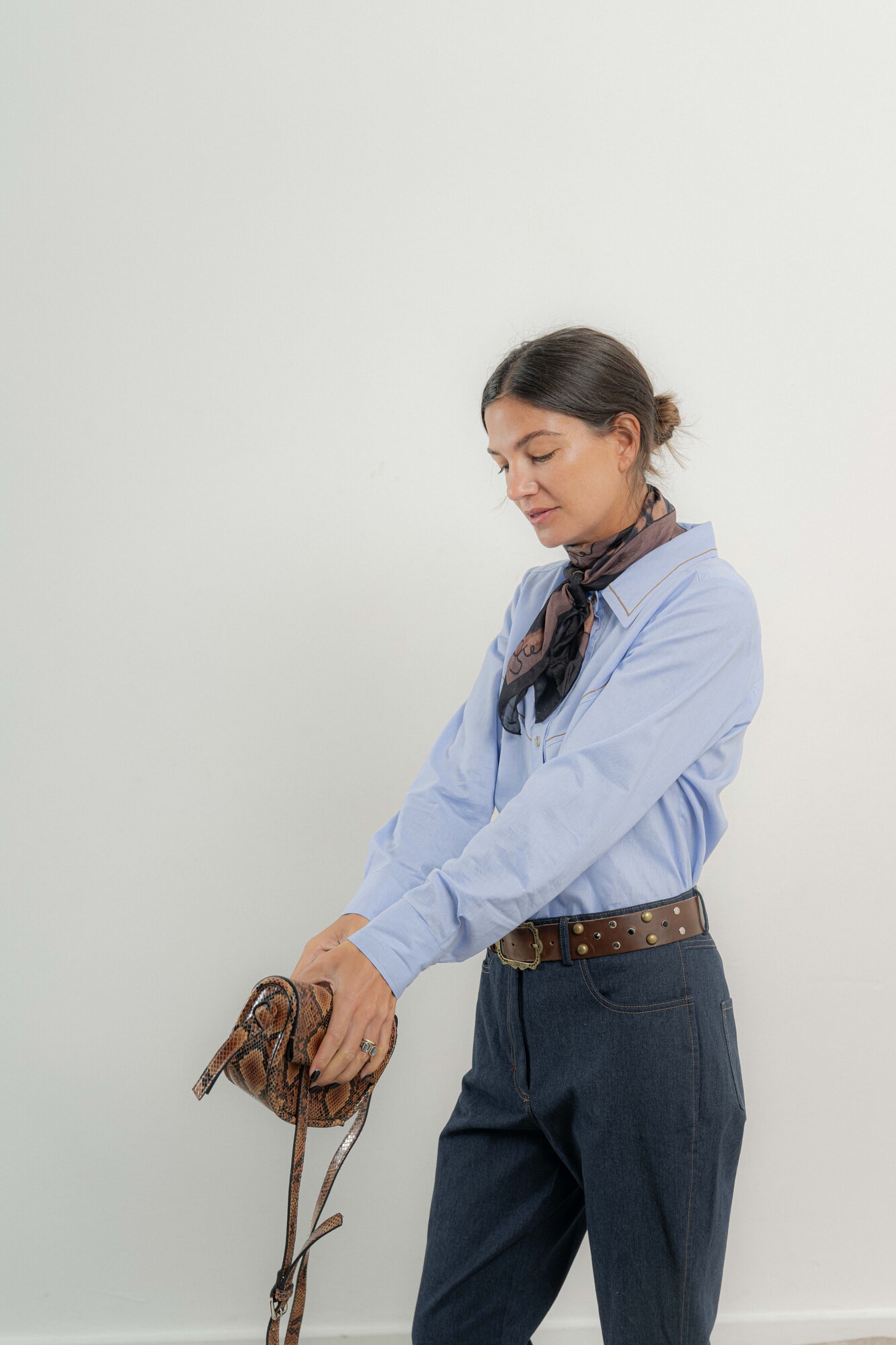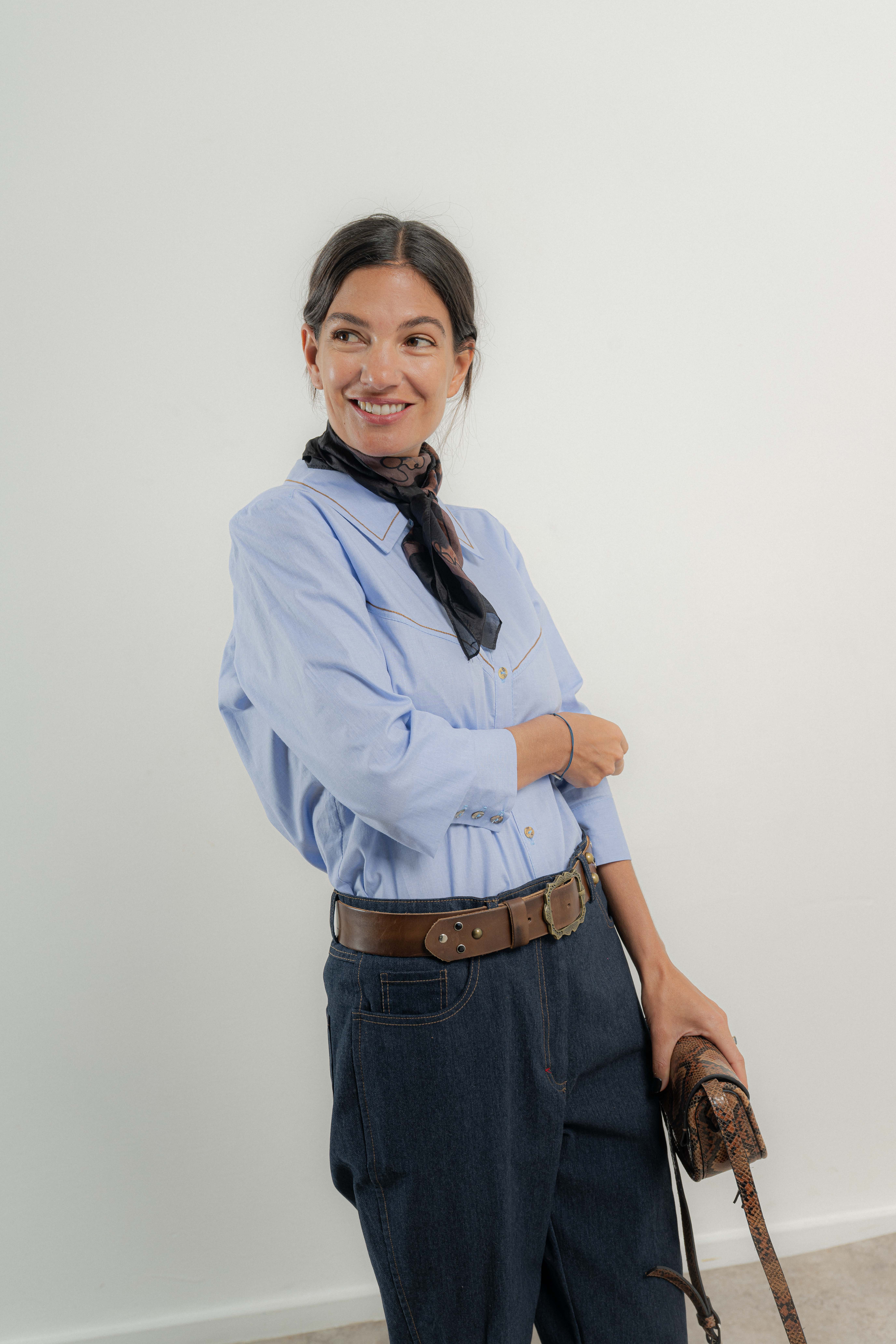 Camisa con cuello tipo masculina. Abotonadura central, manga larga y puños con botones en mangas.