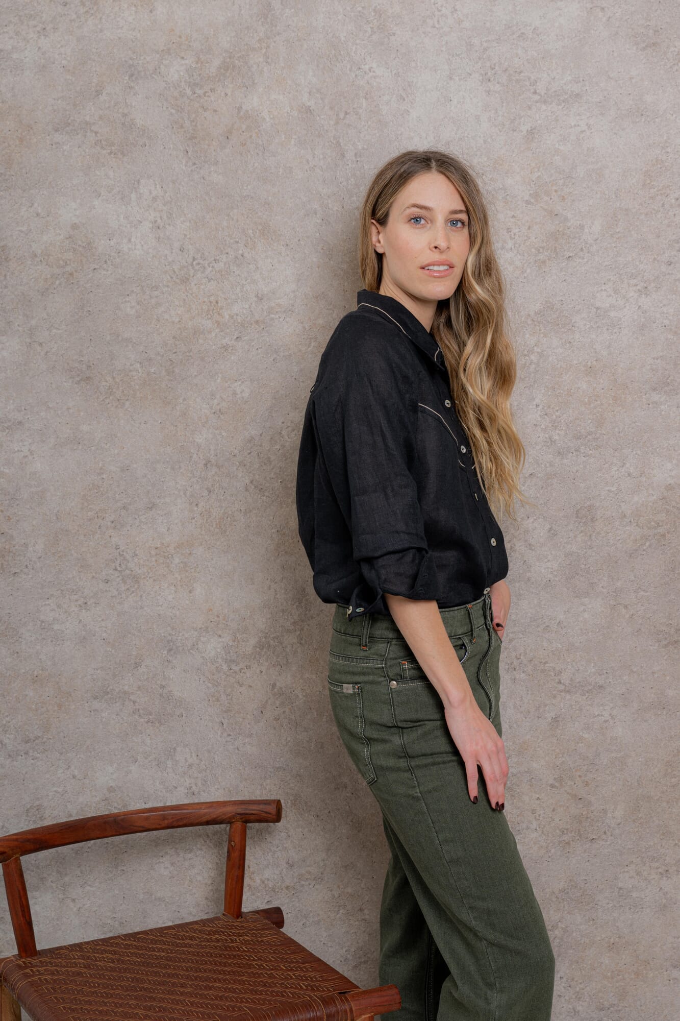 Camisa con cuello tipo masculina. Abotonadura central, manga larga y puños con botones en mangas.
