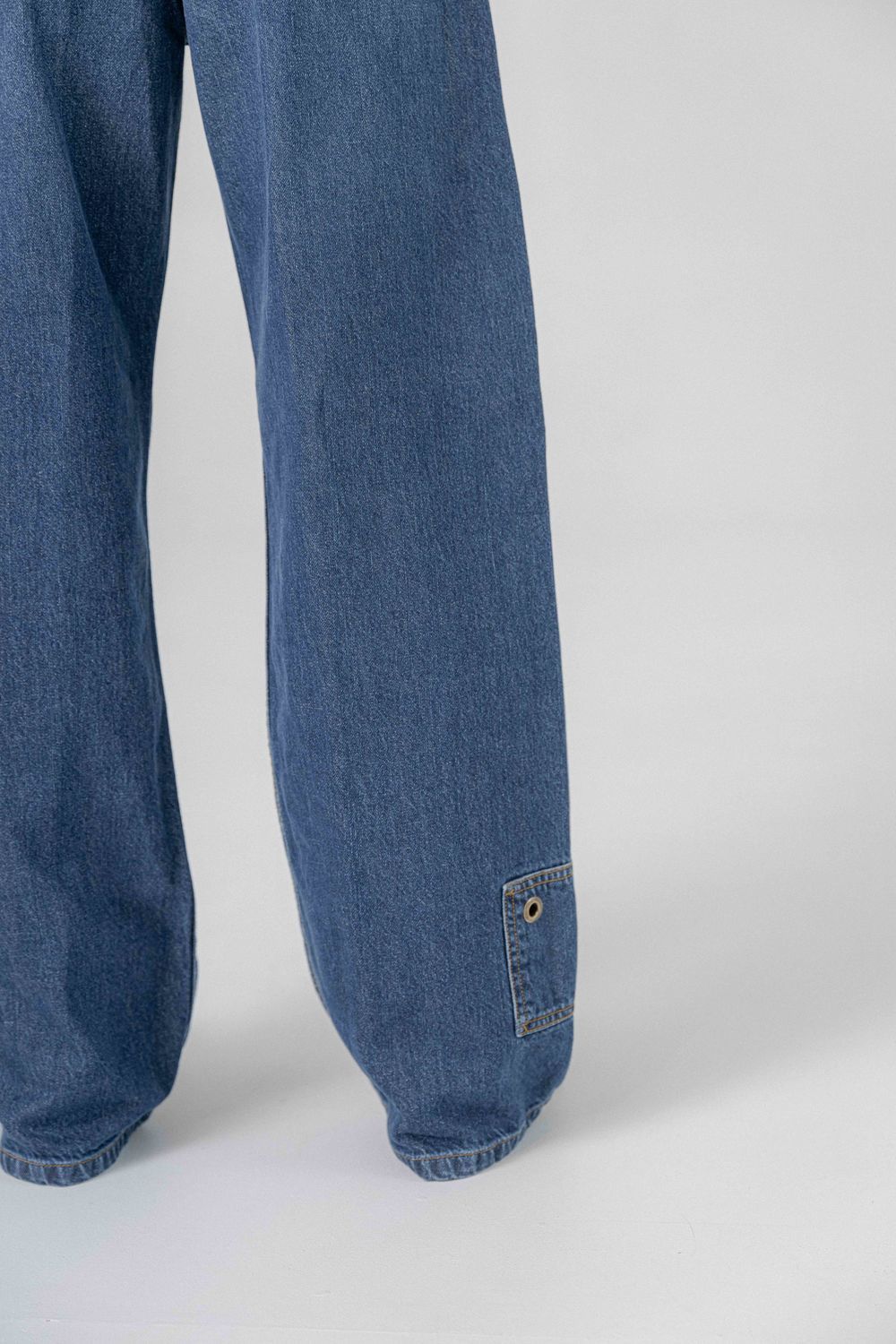 Tiene en una pierna un aplique en el mismo denim con un ojalillo de la marca.