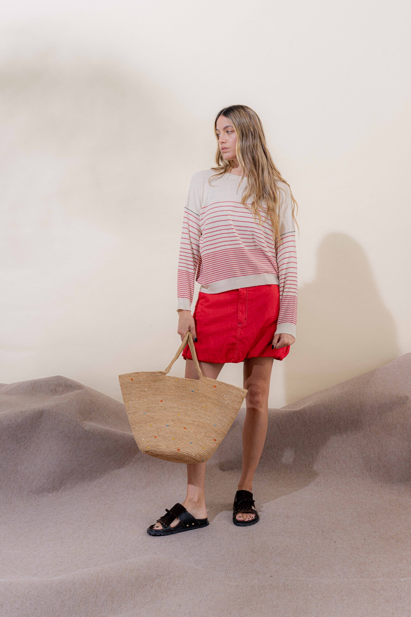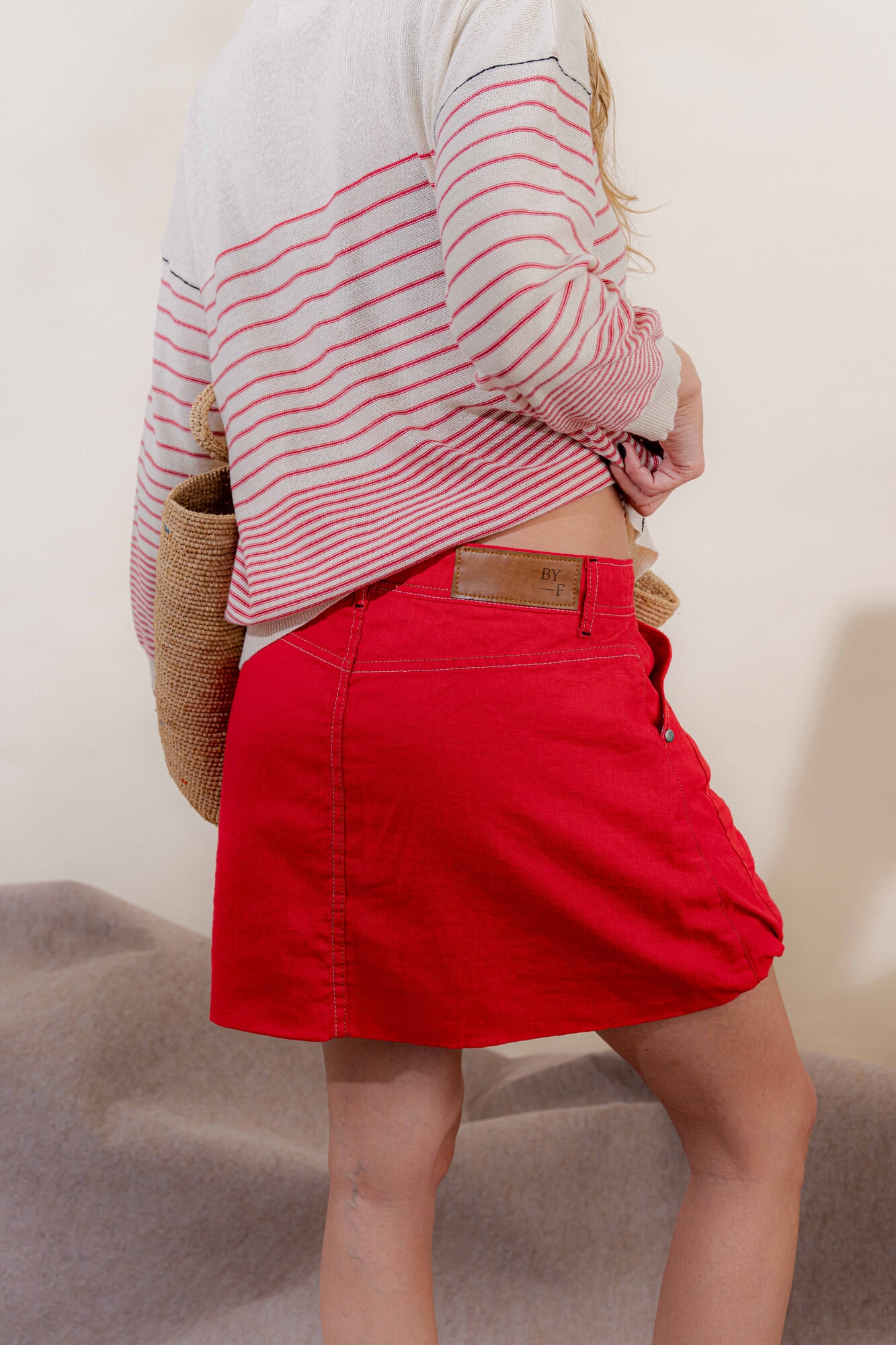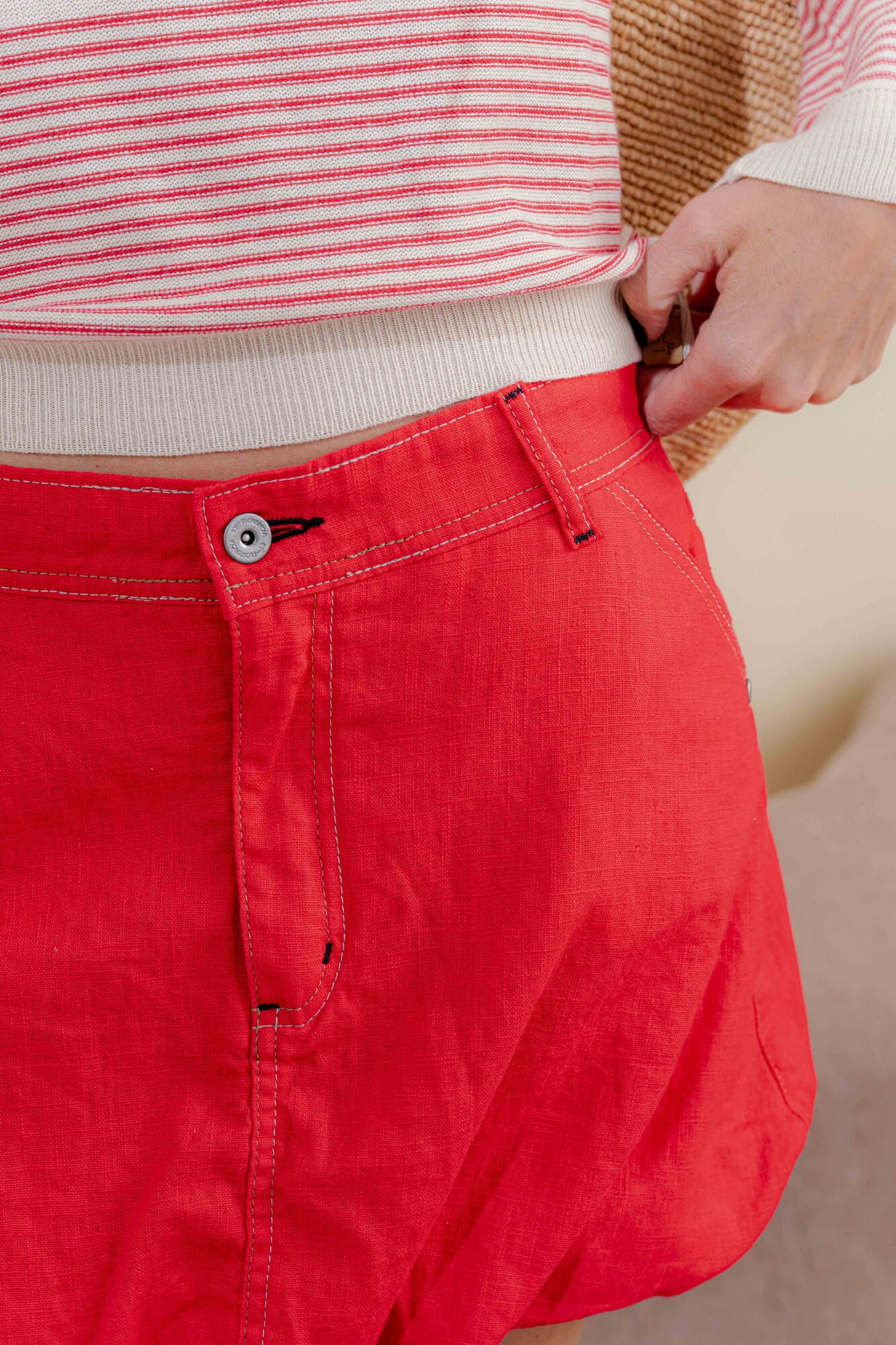 Mini con silueta balloon. Cintura de talle medio con bolsillos laterales y detalle en contraste en los costados. Dobladillo recogido que aporta volumen y un acabado moderno. Tiene bolsillos adelante y una raya en lino aplicado.