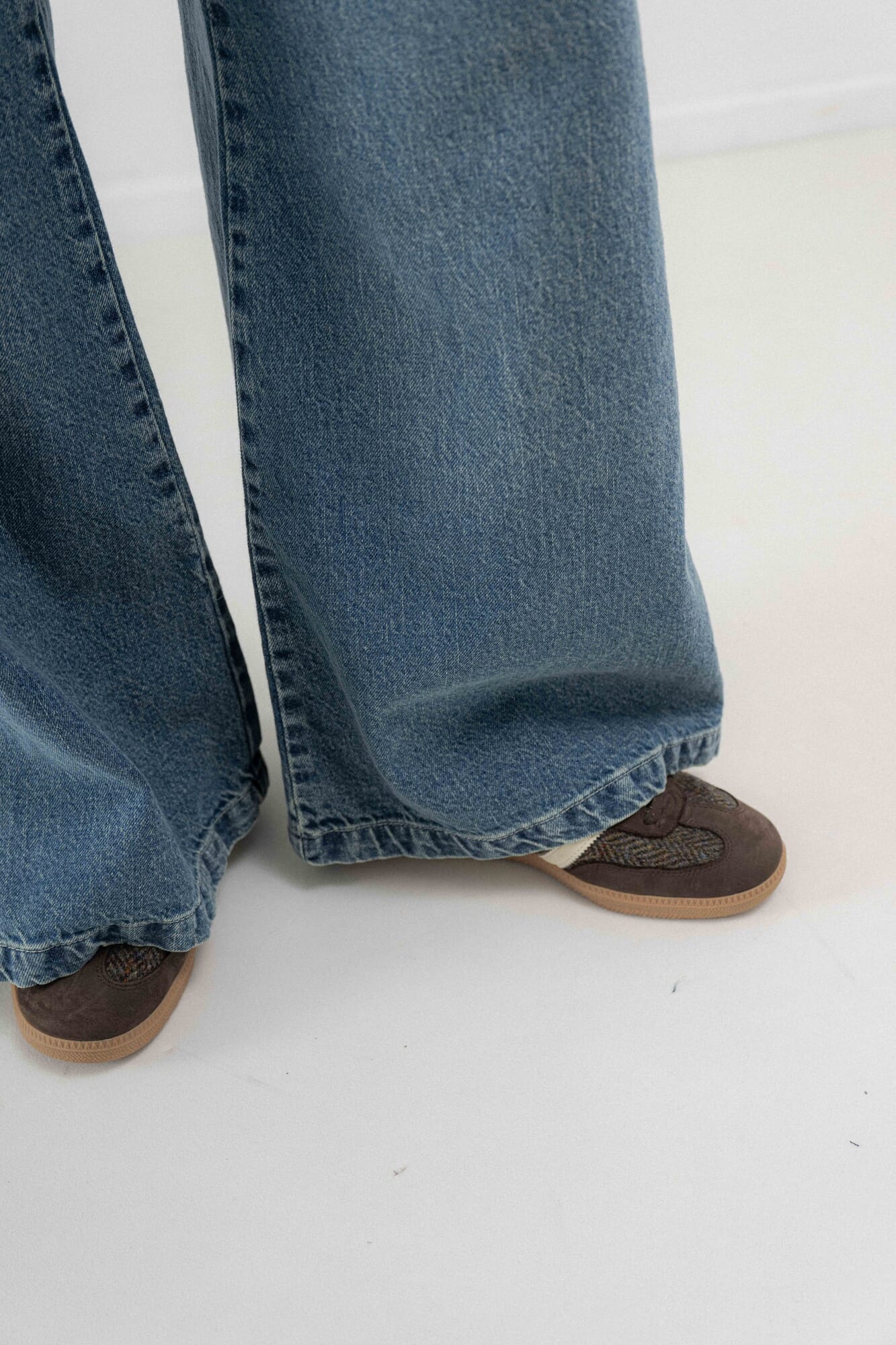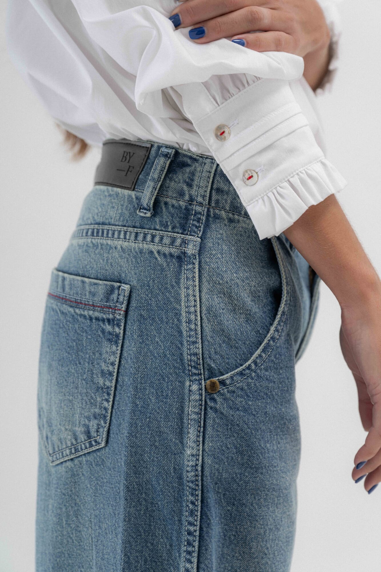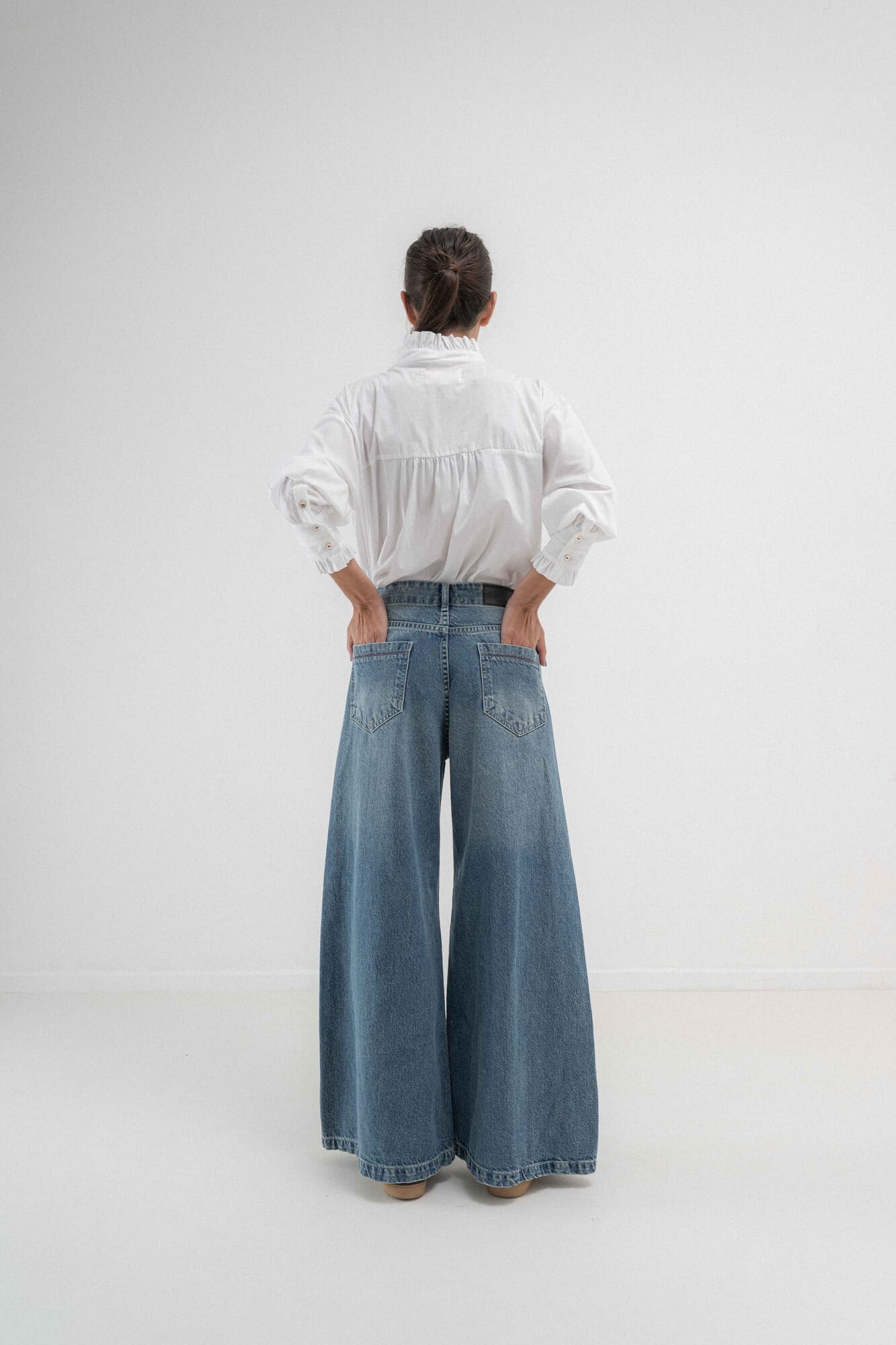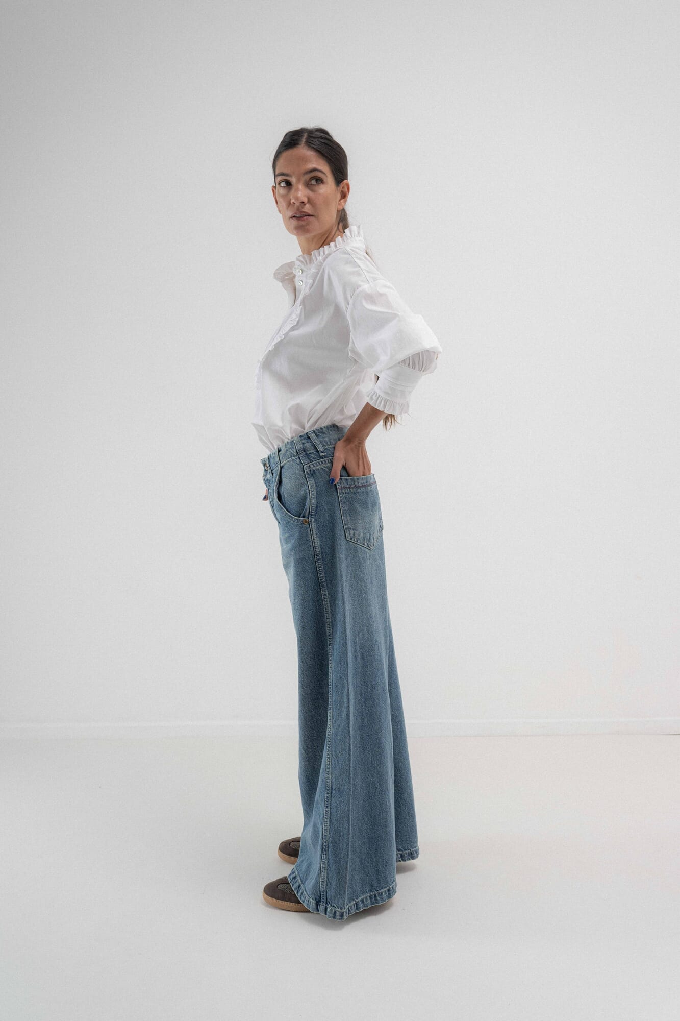 Pantalón en denim 100% algodón con tiro medio y piernas anchas.