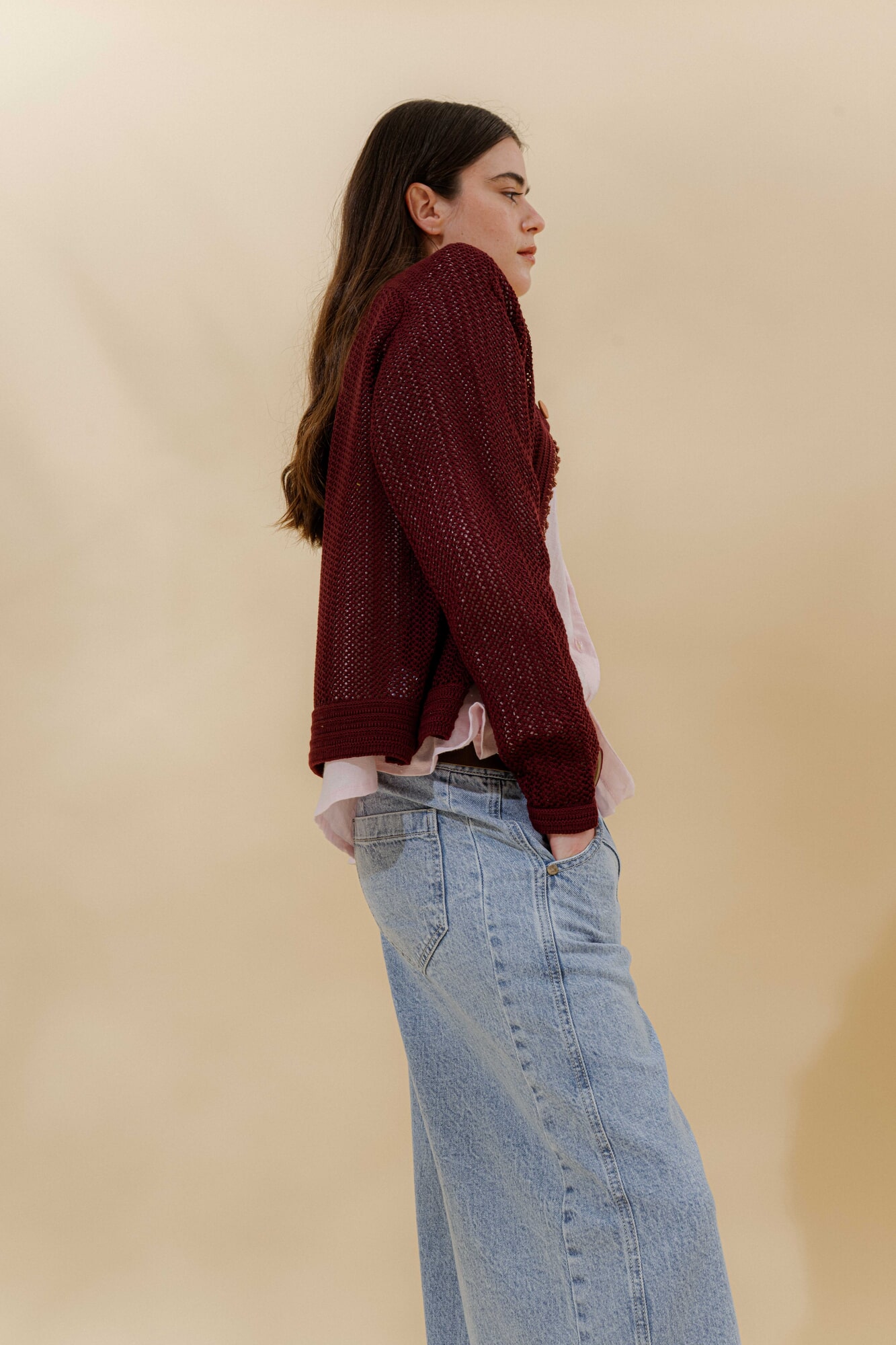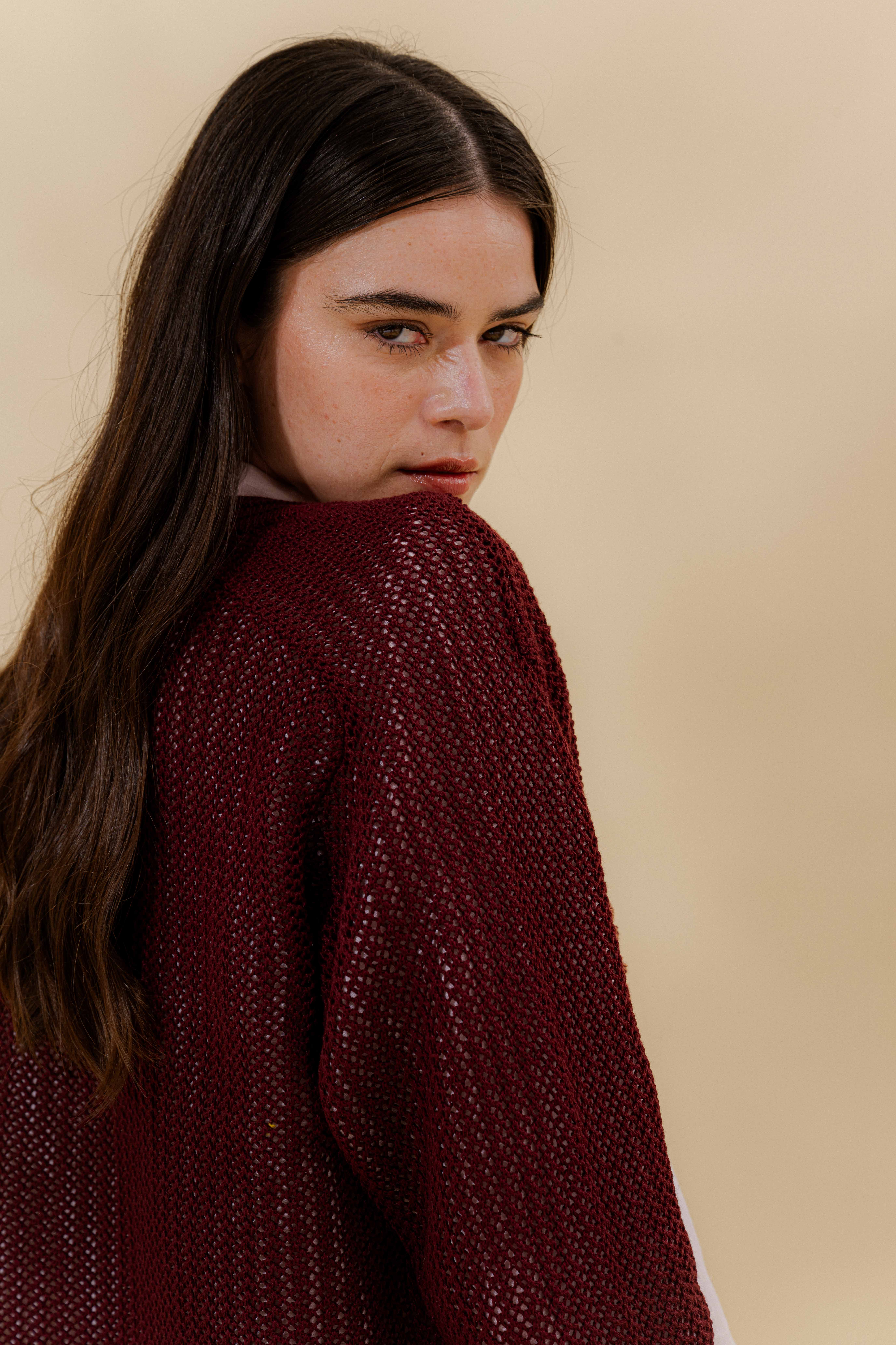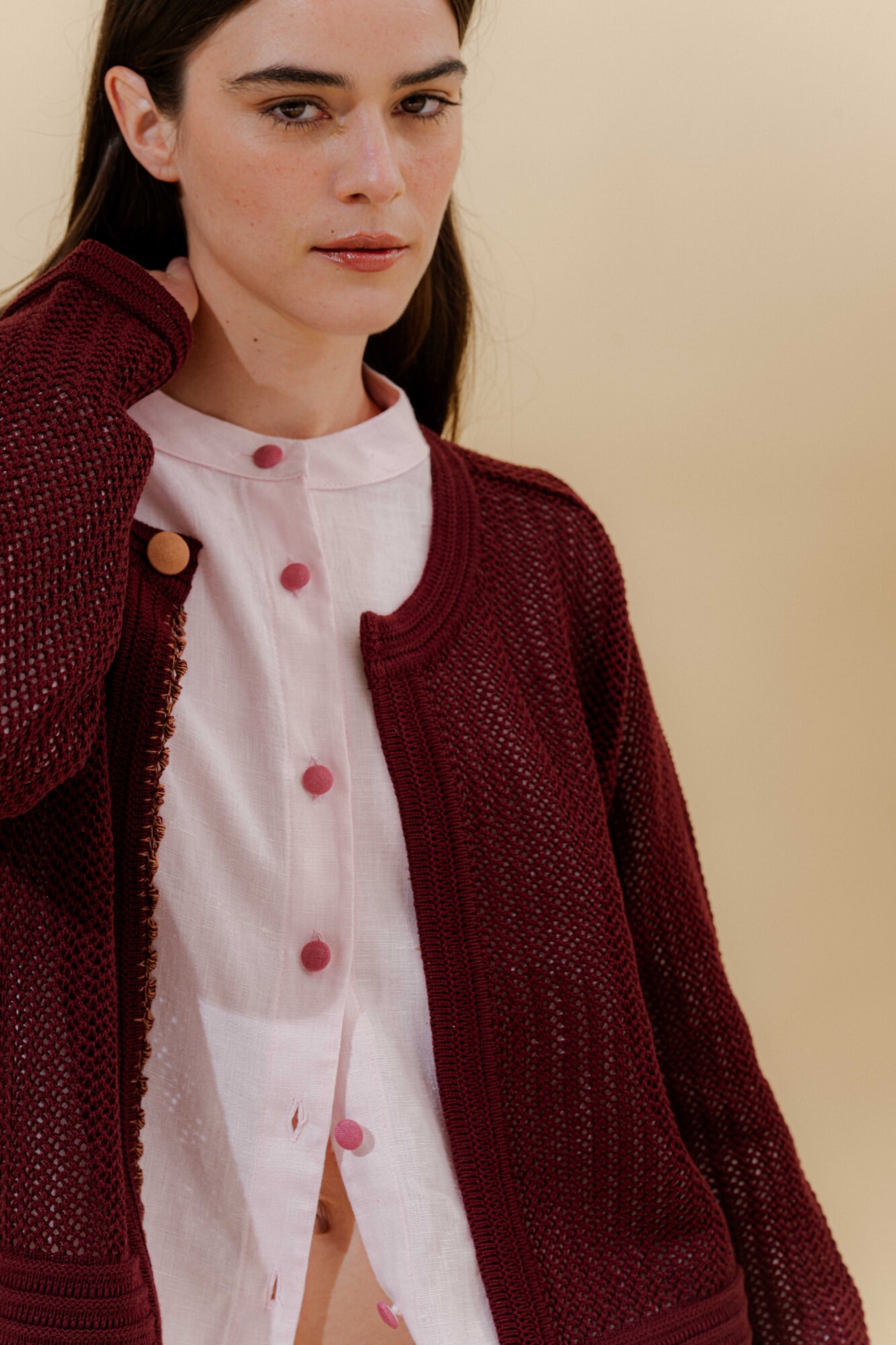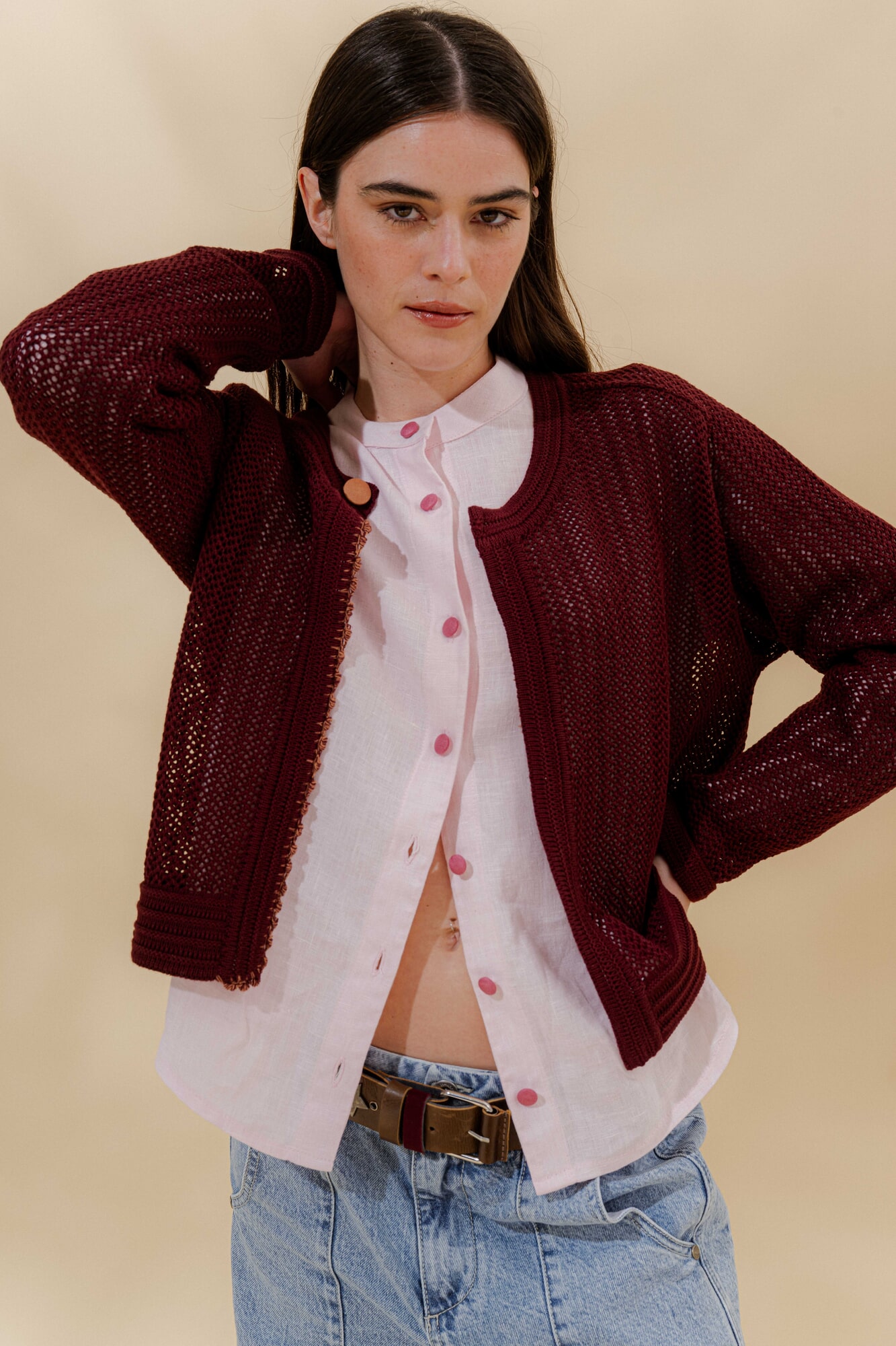 Saco ligero de diseño abierto, confeccionado en punto calado que aporta frescura y comodidad. Presenta mangas tres cuartos y un corte recto que favorece la silueta. El detalle de cierre con botón único en el escote redondo añade un toque distintivo y versátil, ideal para combinar con prendas básicas o vestidos fluidos