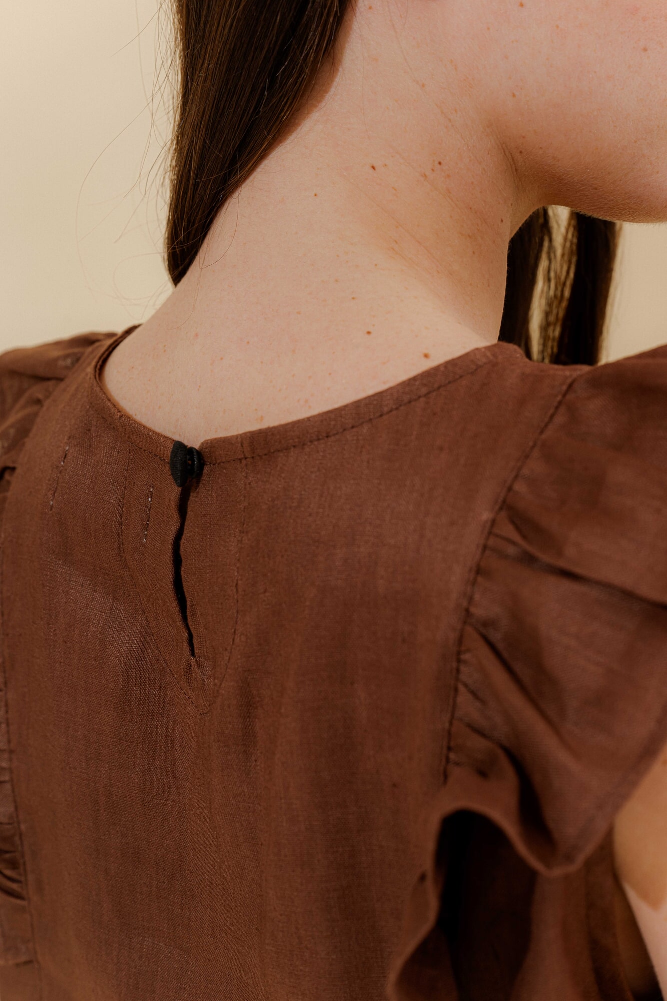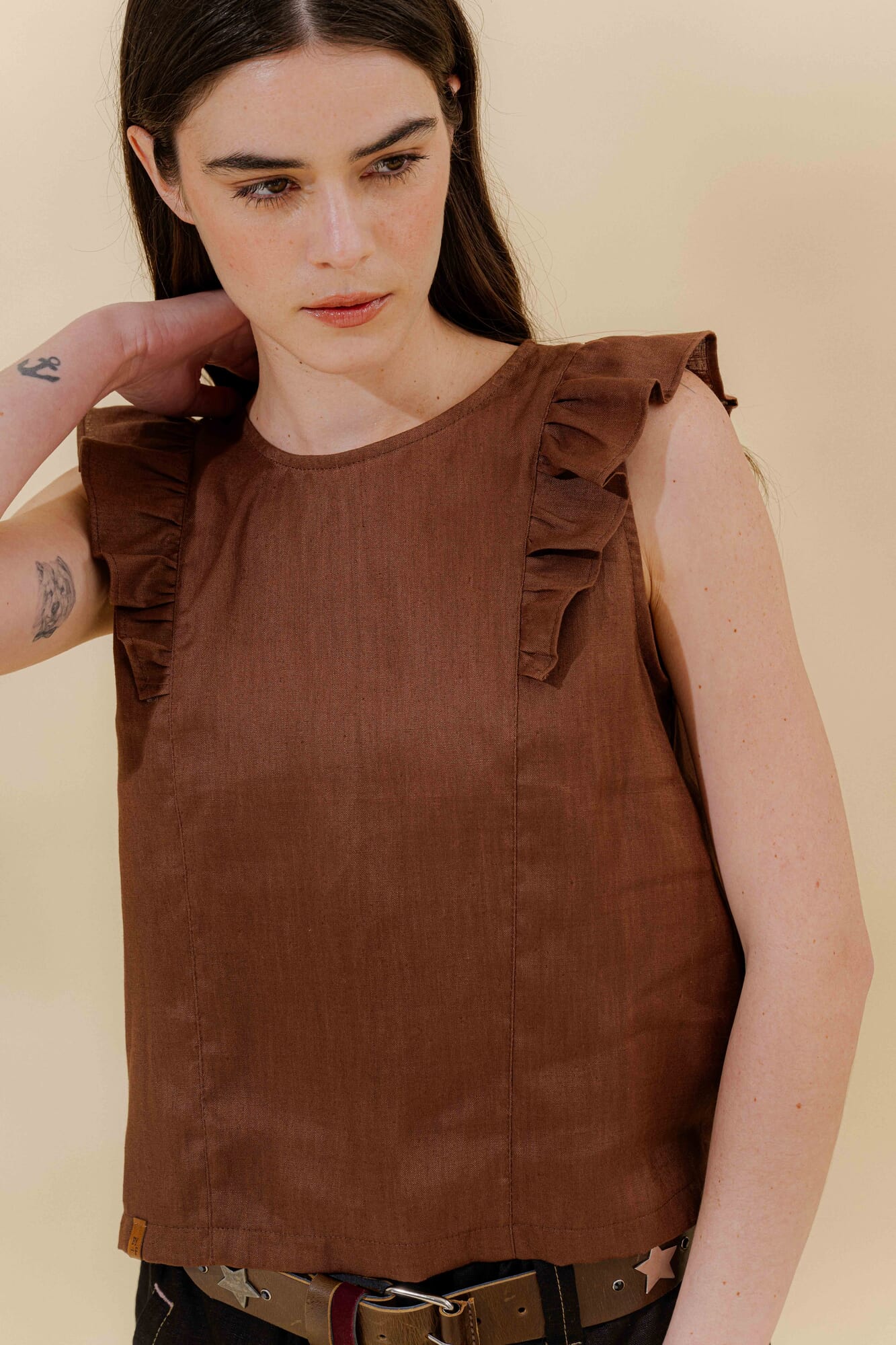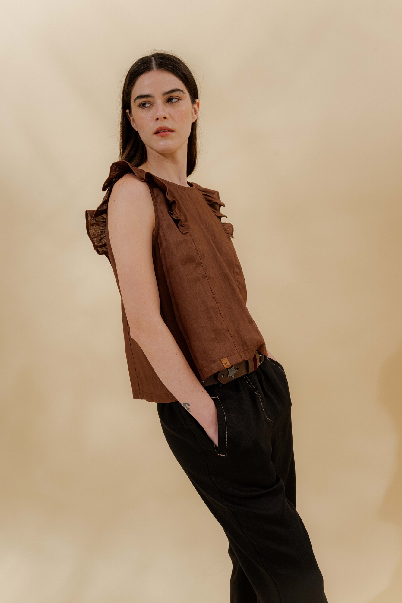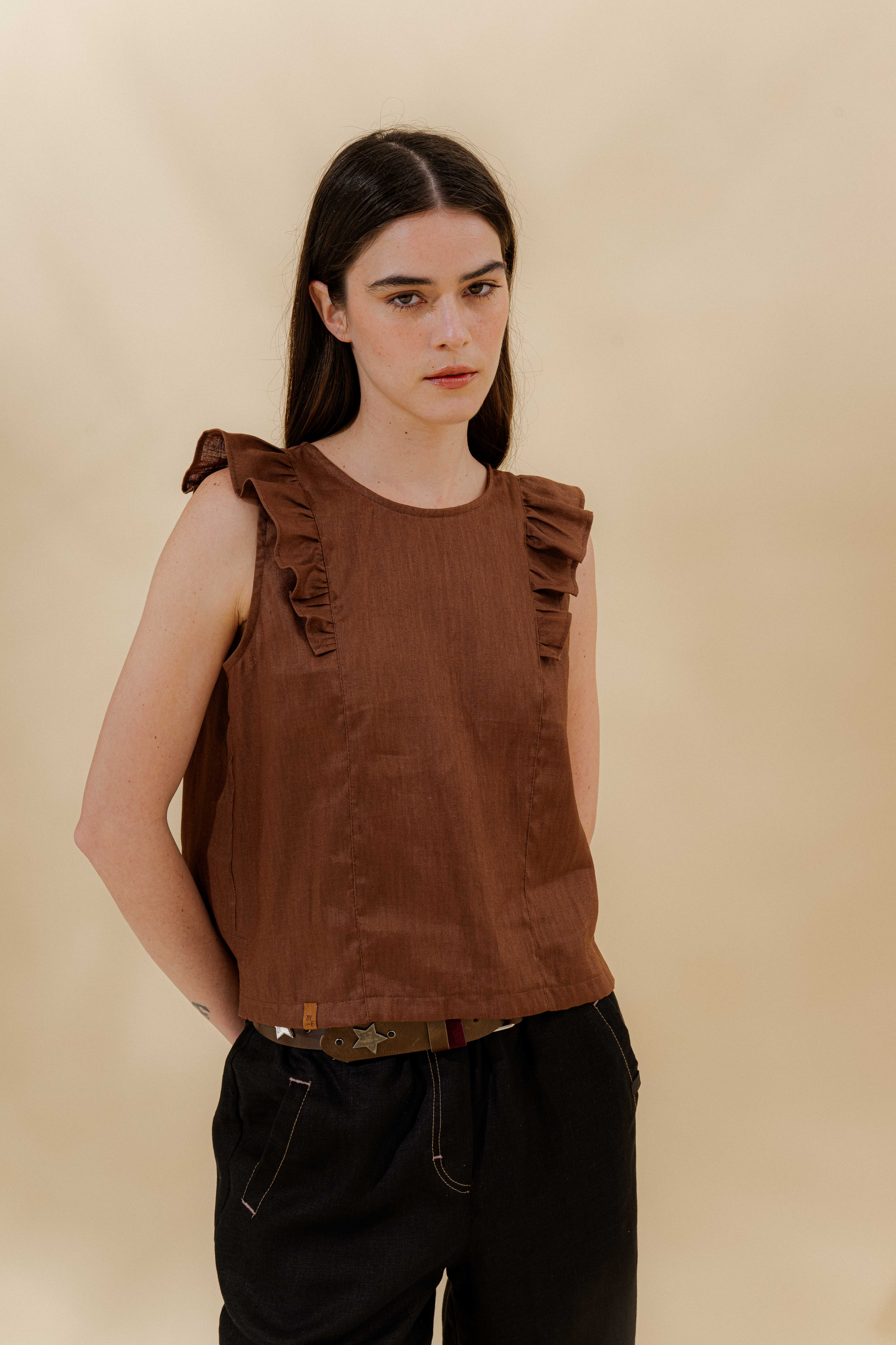 Top de lino 100 %, ligero y fresco, tiene volados delicados en los hombros y corte recto que evoca elegancia natural.
